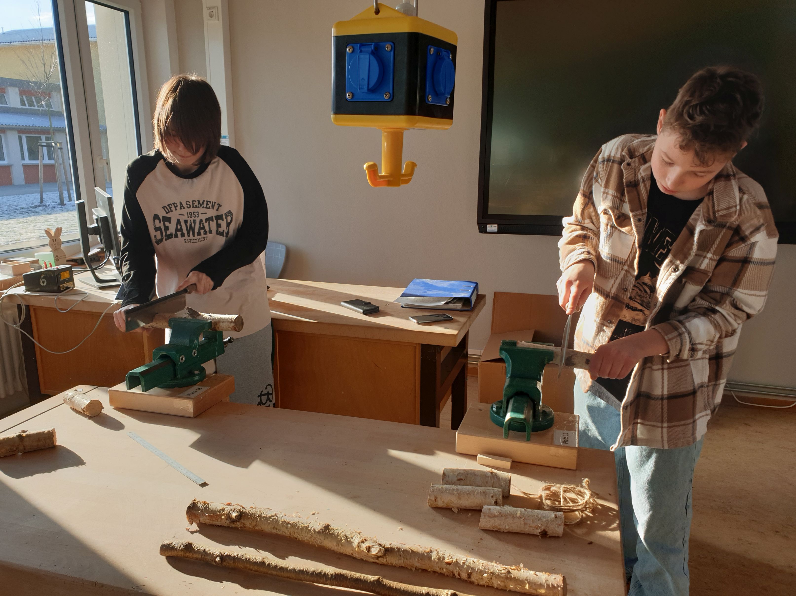 Nach der theoretischen Vorbereitung folgte der praktische Teil: Mit viel Eifer und Kreativität ging es ans Werk. Die Kinder sägten Bambusstäbe, zerkleinerten Schilfrohr, bohrten Löcher in Holzstämme und verteilten alle Materialien sorgfältig in vorbereitete Holzkästen. Dabei bewiesen sie handwerkliches Geschick und große Begeisterung für den Naturschutz.