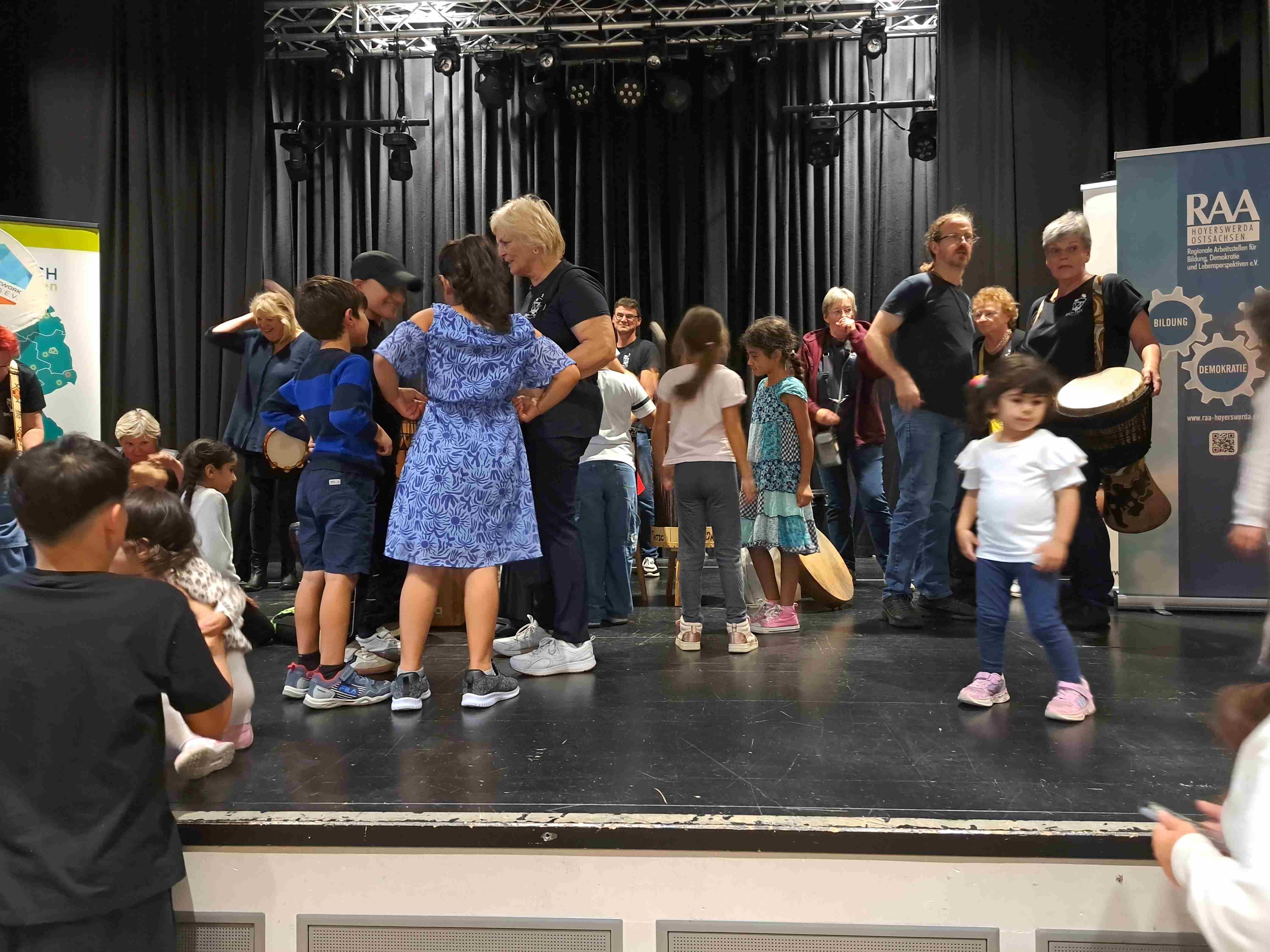 Die Veranstaltung war gut besucht, es waren ca. 120 Personen aus aller Welt in der Kulturfabrik. Der Höhepunkt war der Auftritt von „Dumtastic“ der Percussion Gruppe der KUFA. Mitreißende Rhythmen bewogen einige zu tanzen, die Kinder konnten sich dann auch selbst an den Drums probieren. Ein weiteres Highlight war eine Spende von Robert Gbureck (Schoko und Luise), der Eis für alle Kinder spendierte.