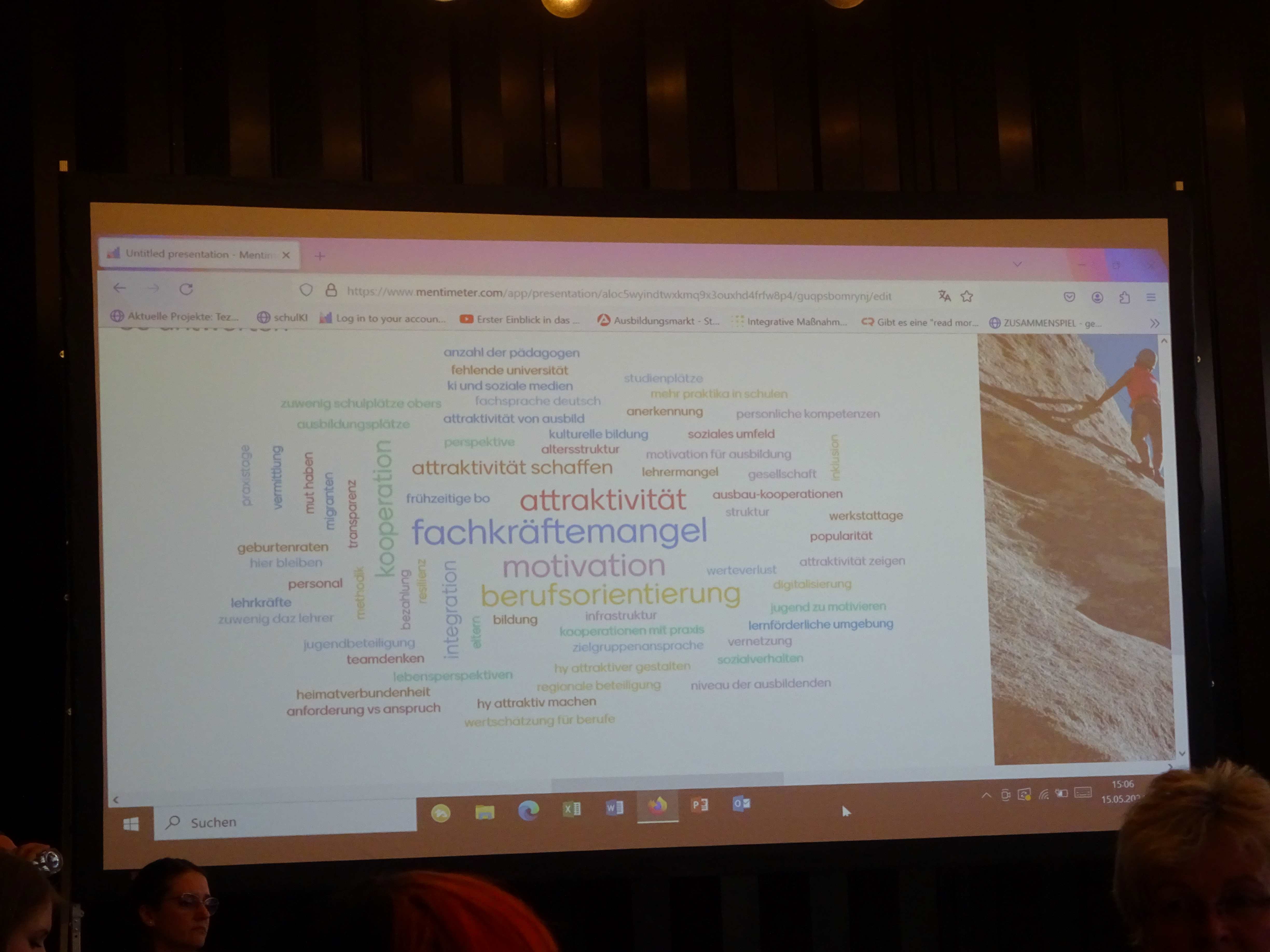 Mittels Mentimeter konnten die Teilnehmer*innen darüber abstimmen, welche Herausforderungen der Wandel in Stadt und Region aus ihrer Sicht mit sich bringt. Besonders häufig wurde dabei „Fachkräftemangel“ , „Attraktivität“ oder „Berufsorientierung“ genannt.