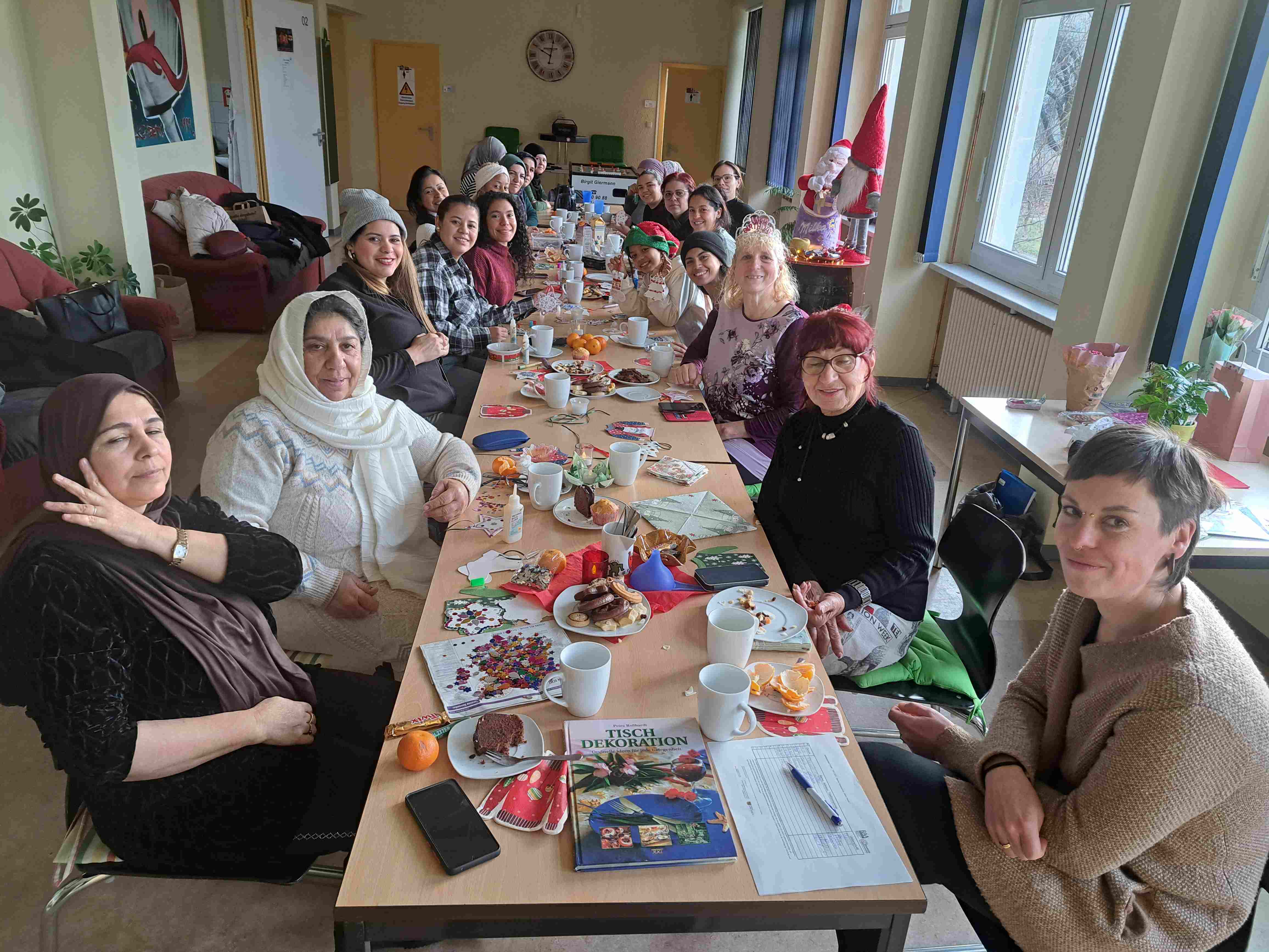 Auch beim Frauentreff vom Projekt HIP wurde Weihnachten gefeiert. Weihnachtslieder wurden in mehreren Sprachen gesungen. Sowohl Migrantinnen als auch Ehrenamtliche konnten Baumschmuck basteln, Punsch trinken, Kekse und Kuchen essen. Einige der Frauen hatten gebacken und Kuchen für alle mitgebracht. Ein schöner Jahresabschluss.