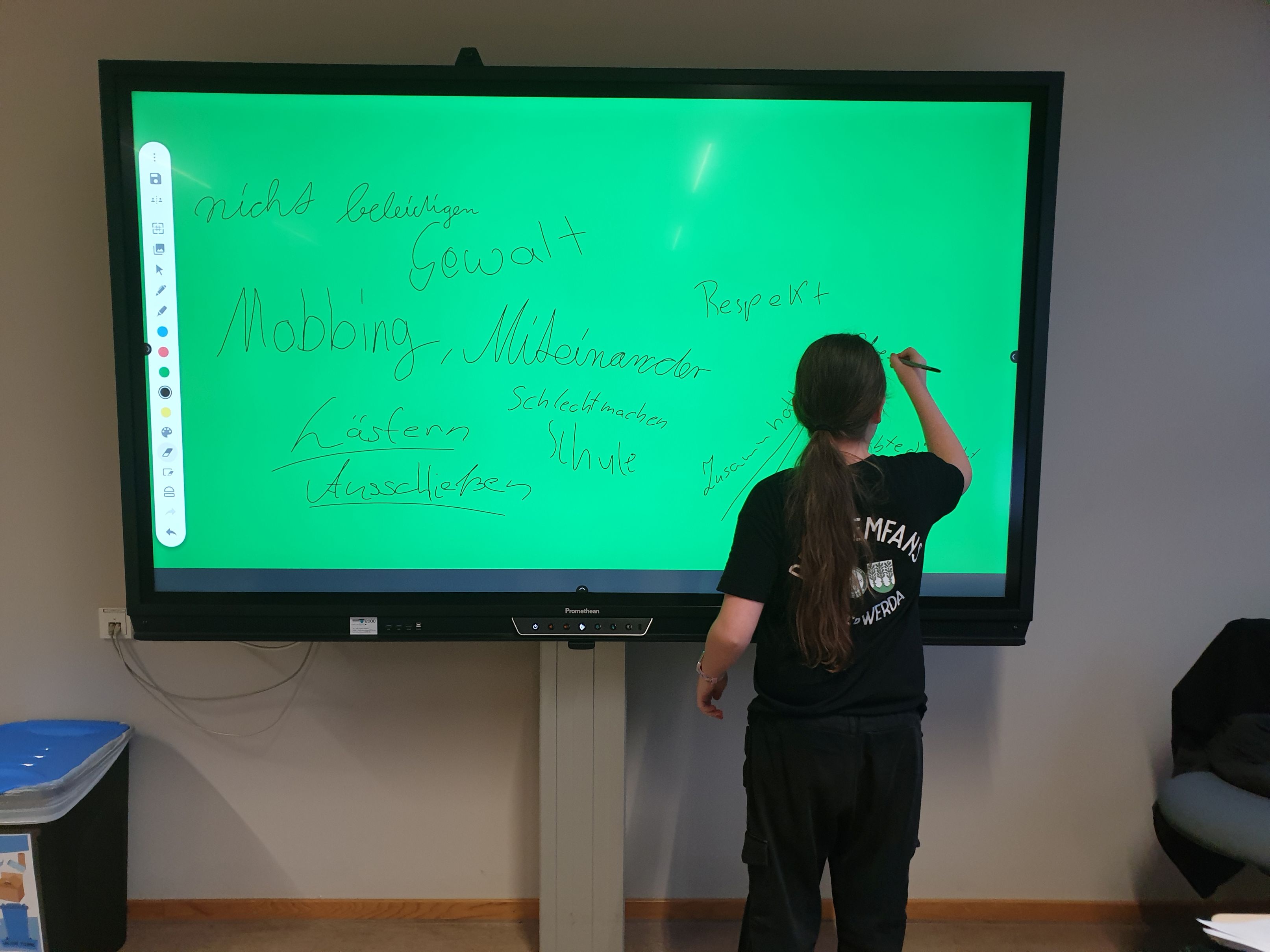 Ein zentrales Thema der Tage war Mobbing – seine Ursachen, Auswirkungen und vor allem Möglichkeiten der Prävention und Hilfe. Gemeinsam erarbeiteten die Schüler*innen ein umfangreiches Tafelbild, das zeigte, welche Folgen Mobbing für Betroffene haben kann: Angstzustände, Depressionen, sozialer Rückzug und der Abbruch von Kontakten. Dieses Thema berührte die Kinder und Jugendlichen sichtlich und regte intensive Gespräche an.