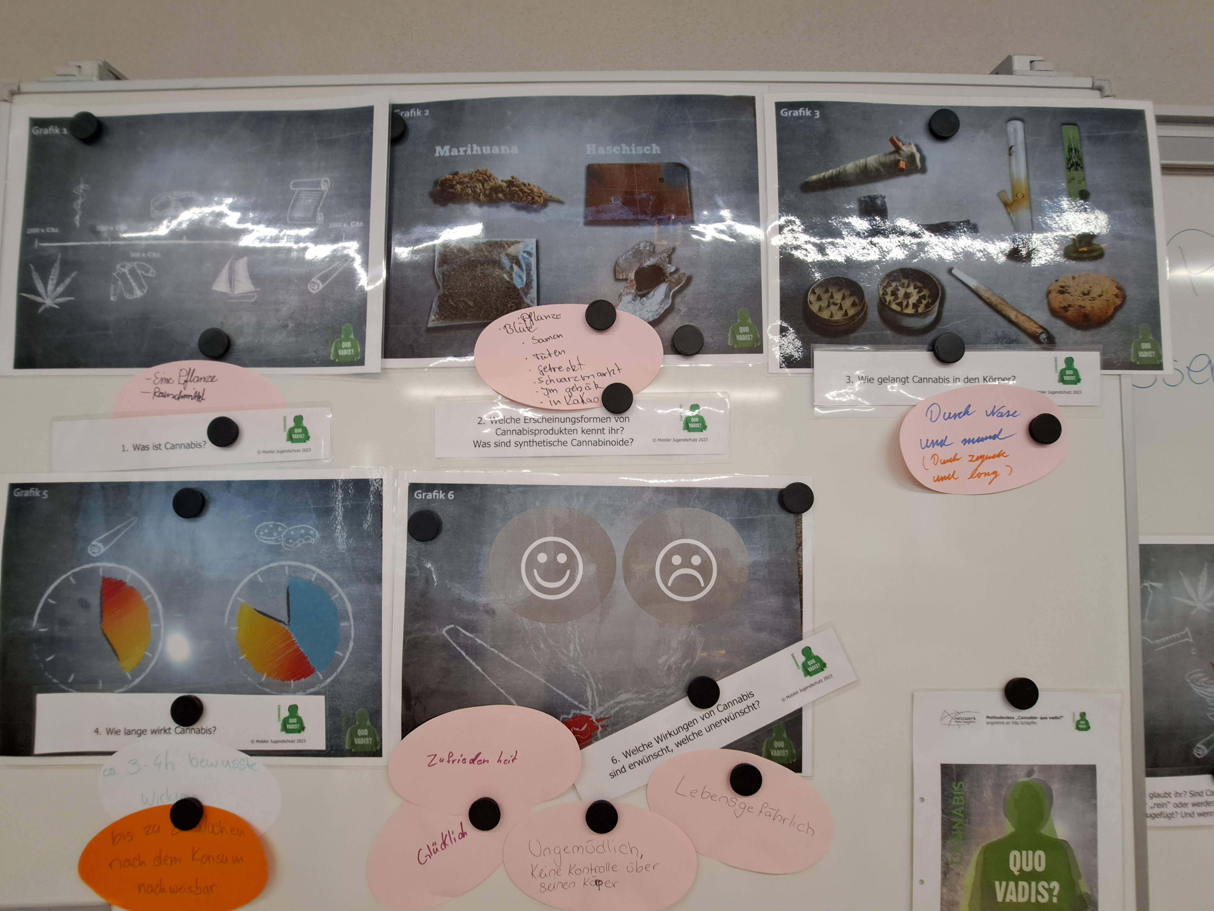Es wurde Wissen rund um das Thema Cannabis vermittelt. Unsere Schüler und Schülerinnen haben in einem kurzen Brainstorming ihre eigenen Assoziationen über diese Droge auf´s Papier gebracht. Relativ schnell wurde klar, dass sich alle mit dieser Thematik bereits auseinandergesetzt haben.