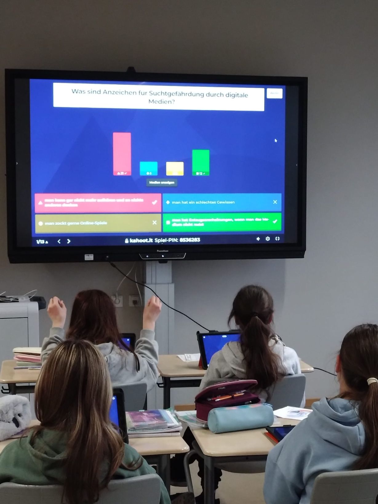In der sechsten Jahrgangsstufe lag der Fokus auf dem Thema Mediensucht. Die Schüler*innen führten einen Mediensuchttest durch, um herauszufinden, ob bei ihnen ein Suchtpotenzial vorhanden ist. Anschließend wurden die Wege in die Sucht, die Definition von Sucht sowie deren Kriterien und Gründe thematisiert. Dabei erarbeiteten die Schüler*innen gemeinsam verschiedene Möglichkeiten zur Suchtprävention. Dazu zählten unter anderem gesundheitliche Schäden, soziale Isolation und aggressives Verhalten als potenzielle Folgen übermäßiger Mediennutzung.
