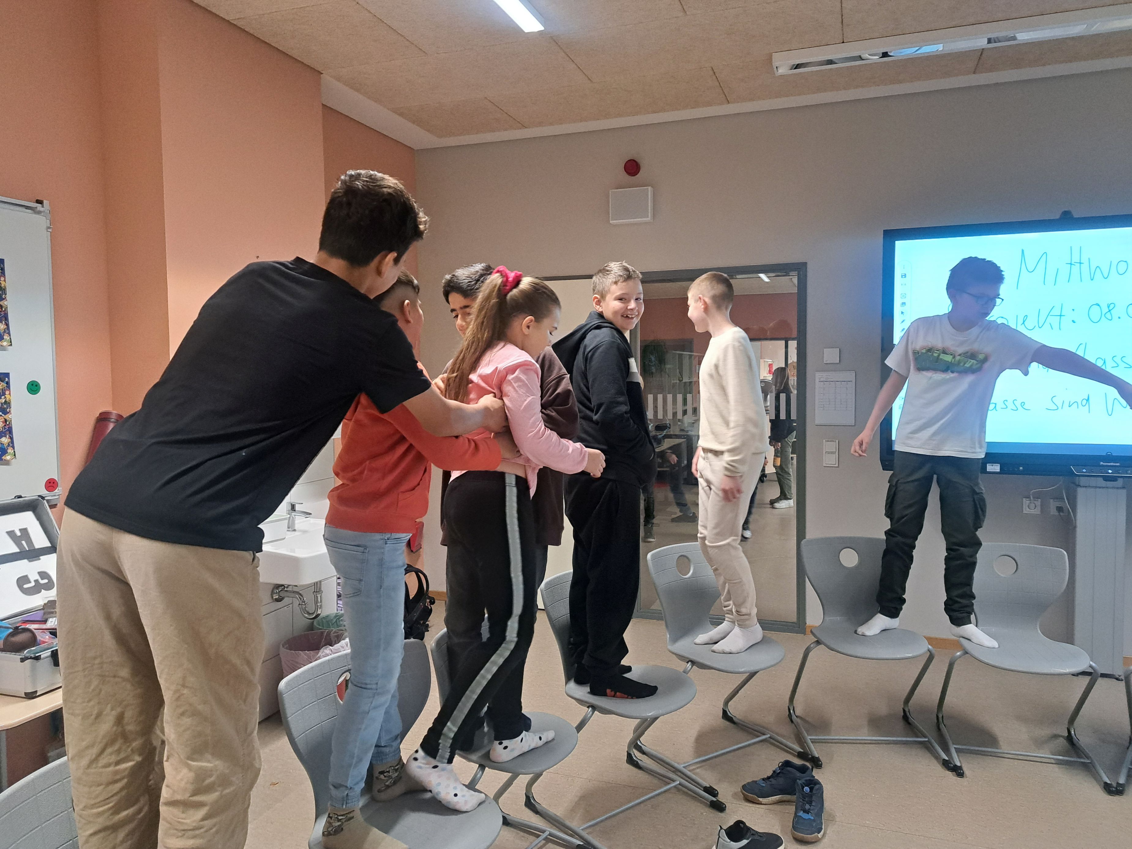 Der Einstieg war mit dem beliebten Stuhlkreisspiel schnell gemacht. Es wurden alle Stühle im Kreis aufgestellt und nun hieß es, sich auf den Stühlen stehend, nach Alphabet zu ordnen, ohne den Fußboden zu berühren. Nicht alle Klassen konnten die Aufgabe souverän meistern.