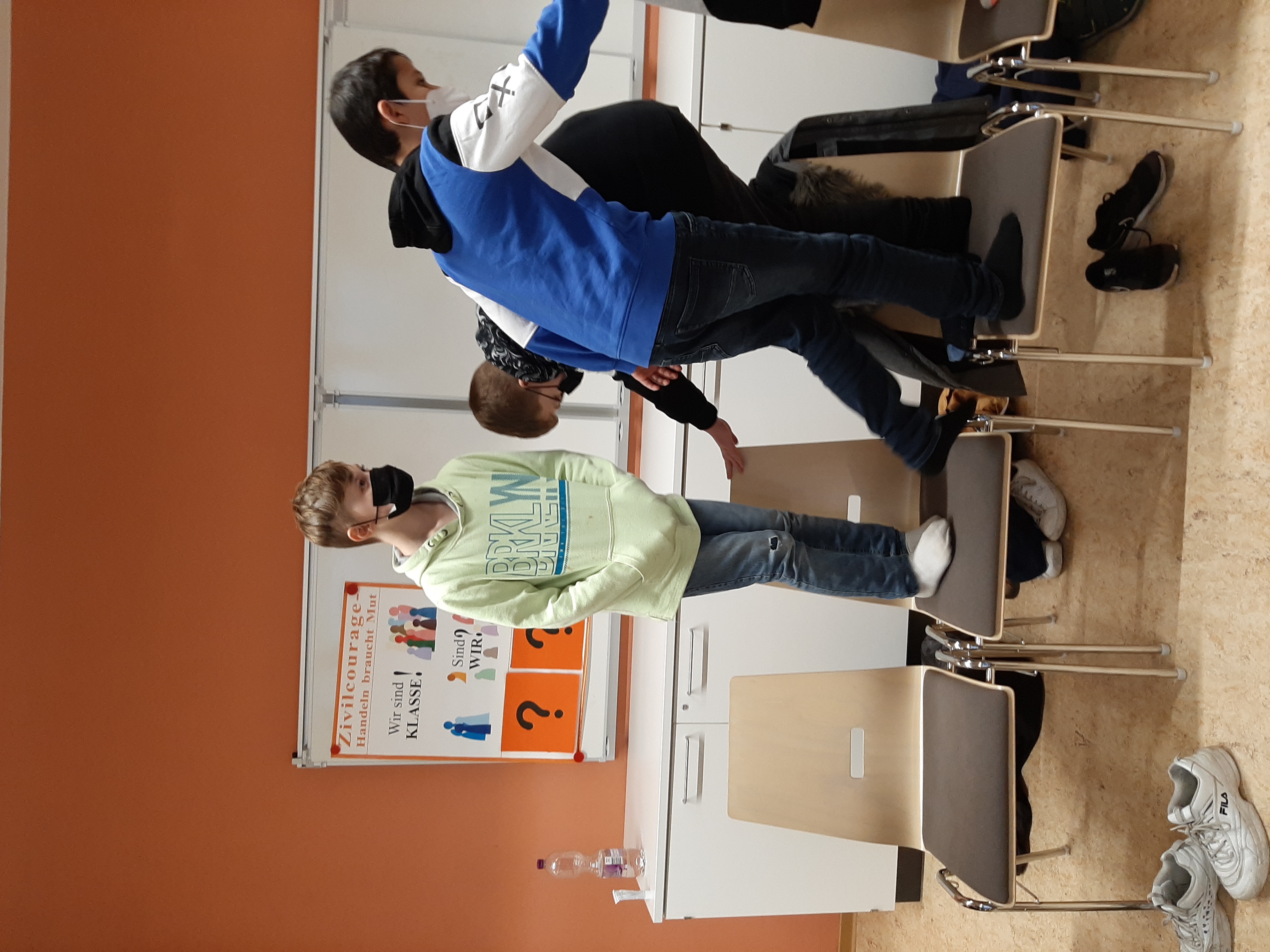 In diesem Projekt ging es darum, unsere Schüler*innen für ein friedliches Miteinander zu stärken und Vorurteile gegenüber anderen Mitschüler*innen abzubauen. Das Projekt wurde mit einem Spiel eröffnet. Alle Schüler*innen standen im Stuhlkreis auf den Stühlen, mussten ihre Vornamen nach Alphabet ordnen, ohne den Fußboden zu berühren und das in kurzer Zeit. Ein Schüler muss den Ton angeben, eine große Herausforderung und ein Spaß für alle. In Gruppenarbeiten und Rollenspielen wurden wichtige Fragen geklärt wie z.B. „Was macht uns mutig“ oder „Was bedeutet Zivilcourage?“. Unter Einbeziehung konkreter Problemfelder der jeweiligen Klasse wurde intensiv mit der Gewaltskala gearbeitet. Zum Abschluss schaute jede*r Schüler*in in einen Spiegel und stellte fest: „Nur ich selbst kann zu einem positiven Klassenklima beitragen“.