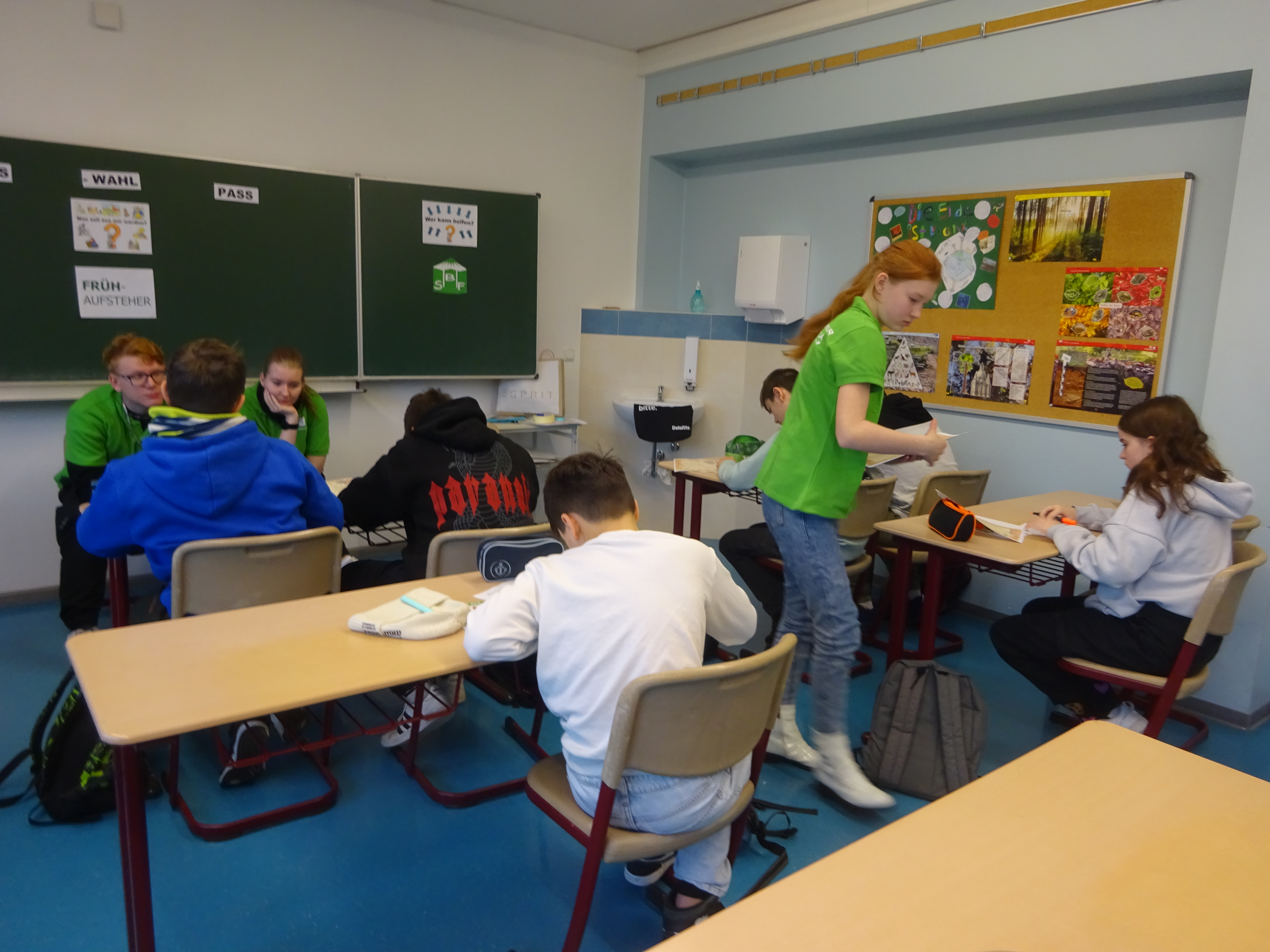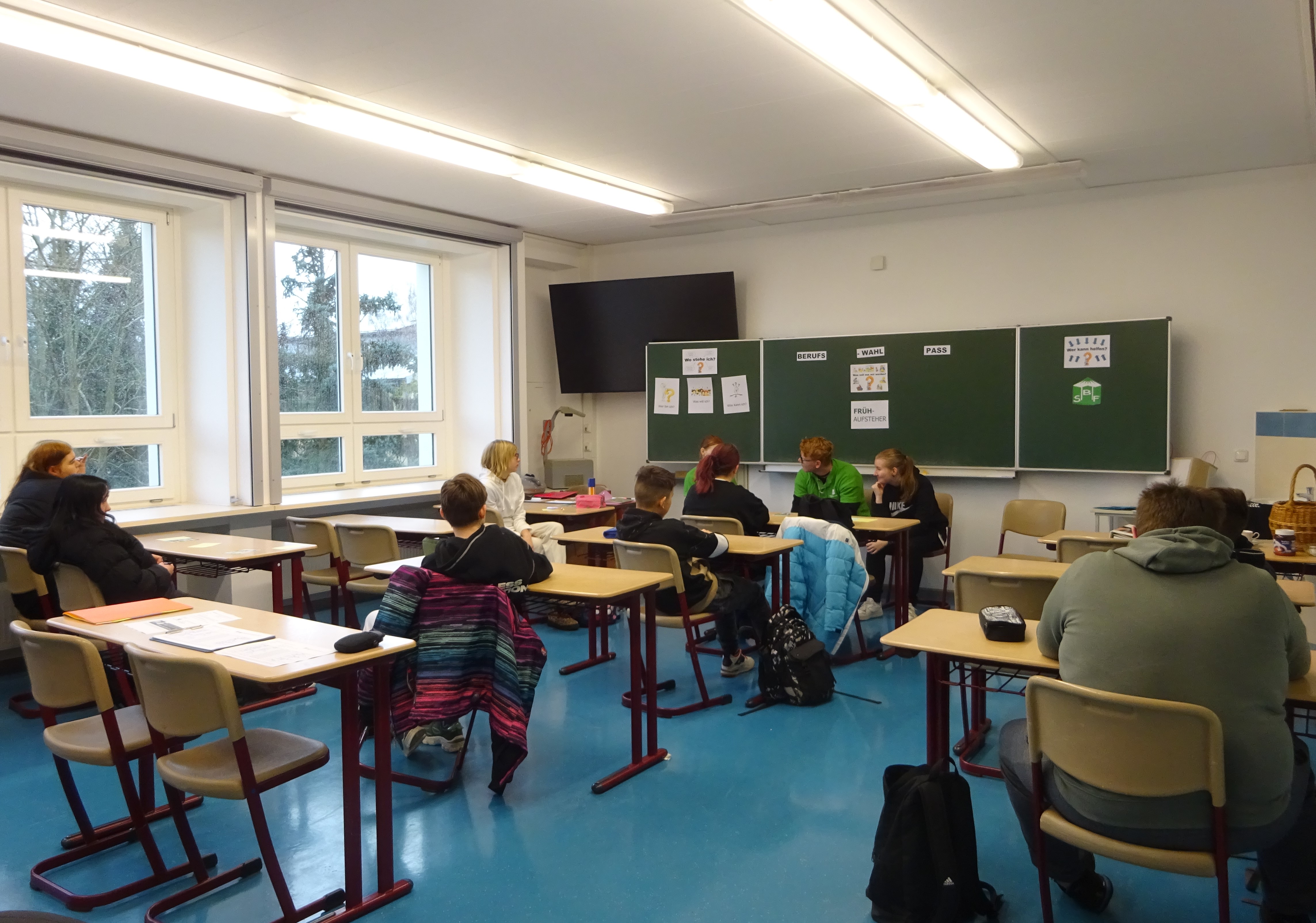 Ende Januar war es dann soweit. Um 7.00 Uhr trafen sich Tim, Sandra, Frau Wolf und Nele diesmal in einem Klassenzimmer, um letzte Absprachen zu führen und die mitgebrachten Materialien an der Tafel zu platzieren. Gespannt warteten wir auf die erste Gruppe. Innerhalb von 90 Minuten, die pro Gruppe zur Verfügung standen, erzählten Tim und Sandra nach der Begrüßung und Vorstellungsrunde von ihrer Arbeit in der Schüleragentur, dass sie ihnen Spaß macht, erfragten Berufswünsche, wollten wissen, wie sie darauf kommen und haben viele Partner vorgestellt, die bei der Berufswahl helfen können. Neuling Nele lauschte den Ausführungen und unterstützte das Team tatkräftig beim Austeilen der Berufe-Rätsel und der begehrten SBF-Steckbriefe.