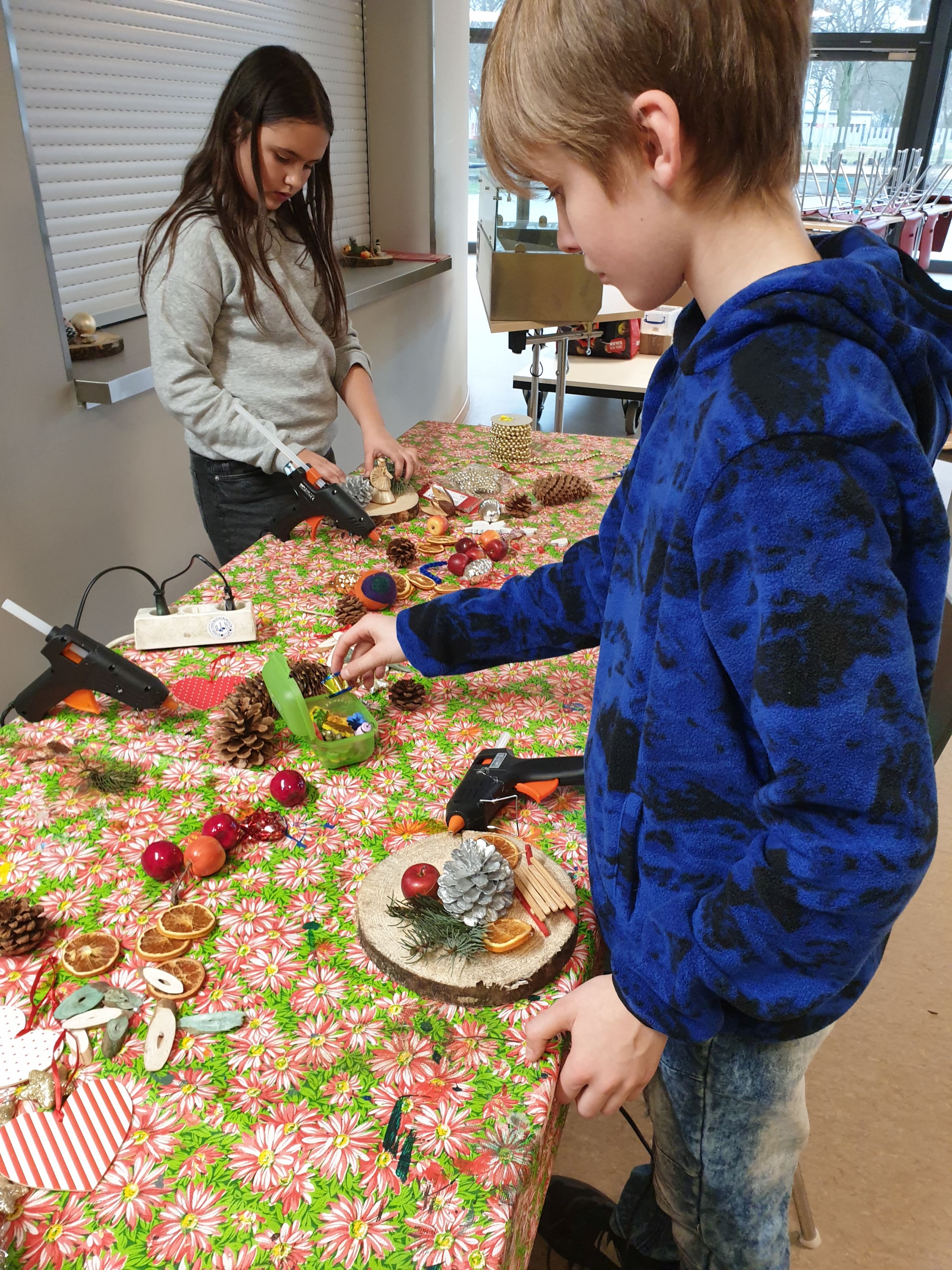 Unter der Anleitung von Frau Schulze-Bubbe entstanden zauberhafte Weihnachtsterne aus Butterbrotpapiertüten – sowohl in groß als auch in klein. Eine weitere Station lud dazu ein, niedliche Bommelmützen aus Wolle zu basteln, die später als Baumschmuck dienten. Holzanhänger warteten darauf, kunstvoll bemalt zu werden. Weihnachtskarten in 3D wurden mit Hingabe gestaltet. Weihnachtliche Figuren aus Papprollen erweckten die Fantasie der Kinder. Sensationelle Gestecke aus Baumscheiben mit glanzvoller Dekoration ließen die Augen der jungen Künstler*innen strahlen.